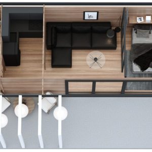 The Kostka I features a simple, cube-shaped design that maximizes space and natural light. Large front glazing measuring 450×220 cm not only creates an impressive façade but also floods the interior with sunlight, making the space feel warm and inviting. The internal layout is thoughtfully divided into three rooms, offering flexibility in usage. Potential configurations could include a spacious living area with a bedroom function, a compact and efficient kitchen, and a comfortably sized bathroom.