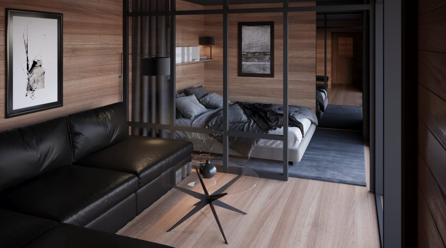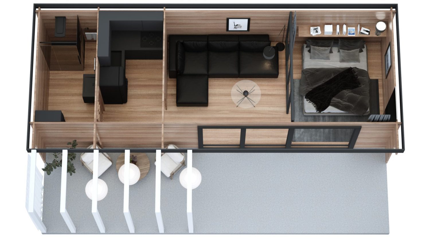 A simple shape in the form of a cube combined with large glazing at the front (450×220 cm) creates an impressive façade that lets in plenty of sunlight. The interior of the house is divided into three rooms that can be freely arranged. For example, there may be a living room with a bedroom function (over 20 m2), a kitchen (approx. 5 m2) and a bathroom (approx. 6 m2). Additionally, a terrace with an area of almost 25 m2 is an attractive place to relax outdoors.