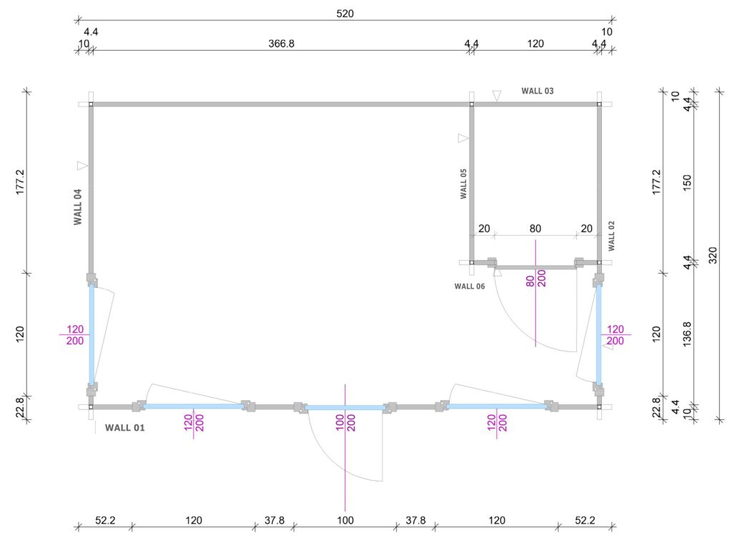 The standard house is made of four-sided logs, 44 mm thick . The whole thing is placed on pressure-impregnated joists and mounted with a double tongue-and-groove system , which ensures durability and reliability for years. A roof with an area of 20.88 m2 and an angle of inclination of 5 °, as well as walls with dimensions of 235.6 / 261.2 cm ensure ease of interior arrangement and comfort of use.